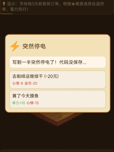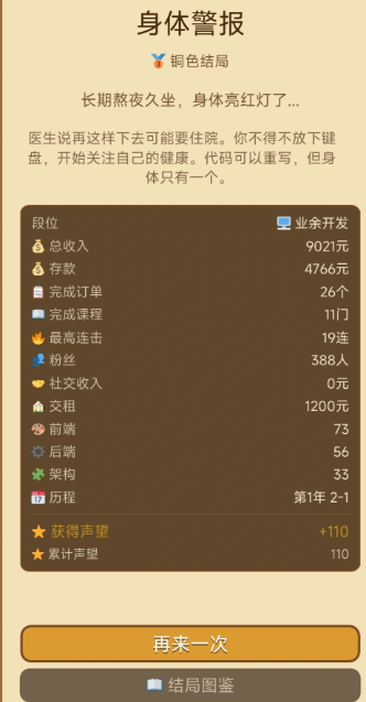 游戏内置多线结局系统:包括因连续高强度工作触发身体预警而被迫终止职业生涯的警示结局;凭借优质作品积累粉丝影响力,获得开源社区认可甚至被科技巨头定向邀约的合作结局;以及通过稳健投资与多元收入组合达成真正财务自由的终极成就结局。不同路径所需资源配比与风险控制逻辑差异显著,考验玩家对时间管理、健康管理与职业节奏的整体把控能力。