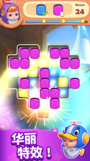 除了基础的三消模式外,本作还引入了更具挑战性的角色救援玩法。在此模式中,玩家需通过消除障碍来解救被困的角色,每一步都需要策略性思考,合理规划才能达成目标。尽管存在步数限制,但游戏节奏轻松,兼具解压与益智特性。无论哪种模式,操作逻辑都非常直观,新手也能迅速适应。同时,每次成功消除都会触发炫目的视觉特效,增强沉浸感,为喜欢此类机制的玩家带来不错的体验。