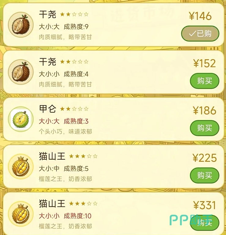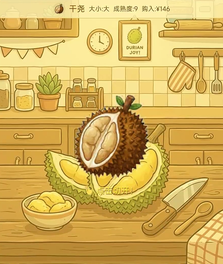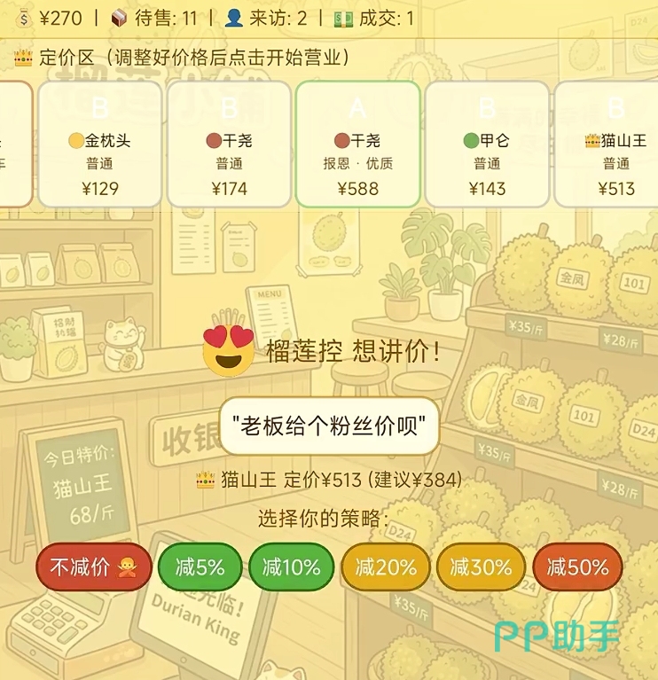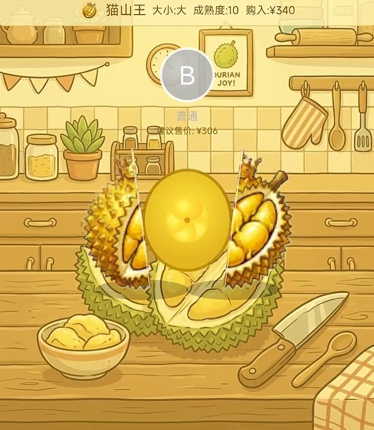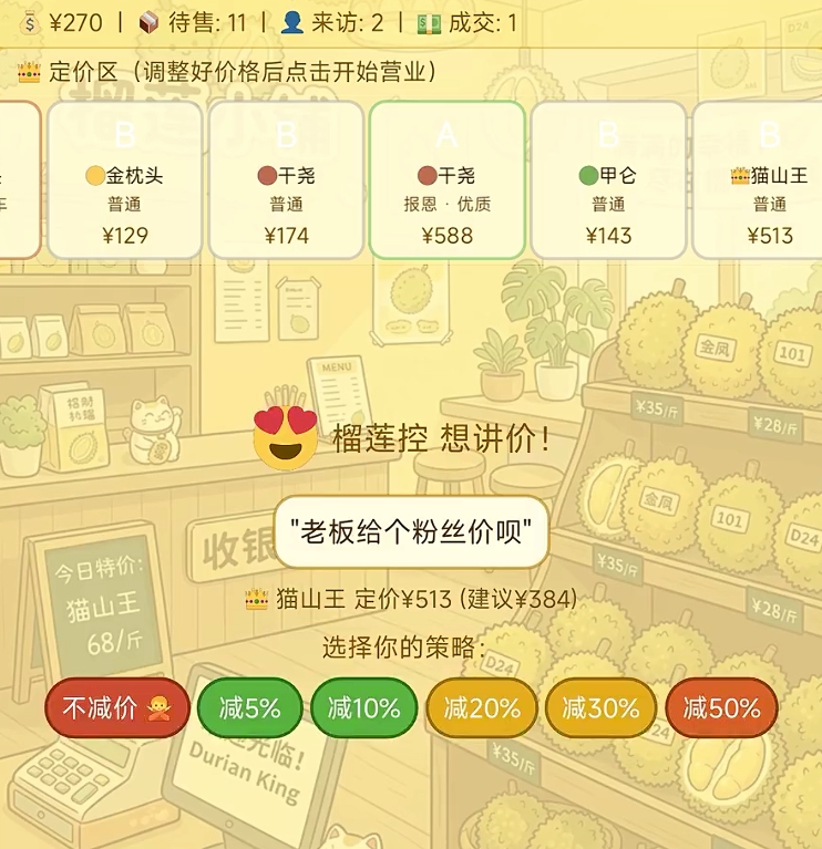 在进货端,玩家可自由选择金枕、干尧、猫山王等多个真实榴莲品种,各品类采购成本差异明显,果肉分布结构亦各不相同。尤为关键的是,每颗榴莲内部果肉饱满度完全随机生成,切开瞬间充满未知性,类似开启实体盲盒的紧张体验。系统会依据实际果肉状态自动标注品质等级(如“普通”“优质”“极品”),并给出建议零售价参考。若开出高品相榴莲,单次销售即可实现高额回报;反之,低产出榴莲可能导致售价低于采购成本,形成真实经营风险,大幅提升重复游玩价值。