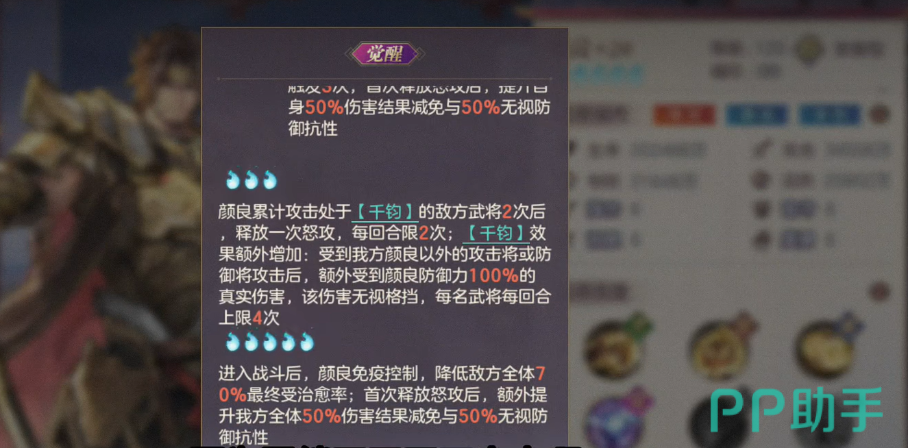 此外,颜良的羁绊系统也为他提供了强大的支援效果,特别是在与防御武将搭配时,可以提高全队的免伤效果,同时增强颜良的防御力和伤害输出。这样的设计使得颜良不仅能够在前排稳稳站住阵地,还能为队友提供有效的保护和增益。