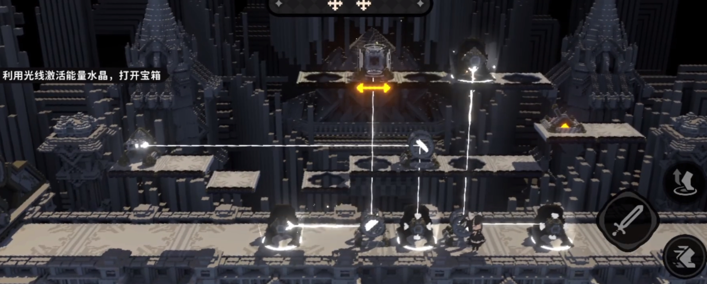 第三关海恩城,开局直接前往第二个交互点,翻转镜面令光线朝上,并触发机关使对应平台下沉,便于后续跳跃操作。紧接着到达第三个交互点,调整镜面使光线向右延伸,同时将黄色平台降下。随后跃至最高处的交互平台,更改镜面方向使光线左射,再跳回地面将黄色平台升起并与第三平台对齐,即可完成本关。第四关晶石营地,进入地图后先抵达最远端的交互点,翻转镜面让光线垂直向上。然后操作黄色机关提升平台高度,接着跳跃到与其齐平的平台上,再次翻转镜面使光线朝上,任务即告完成。