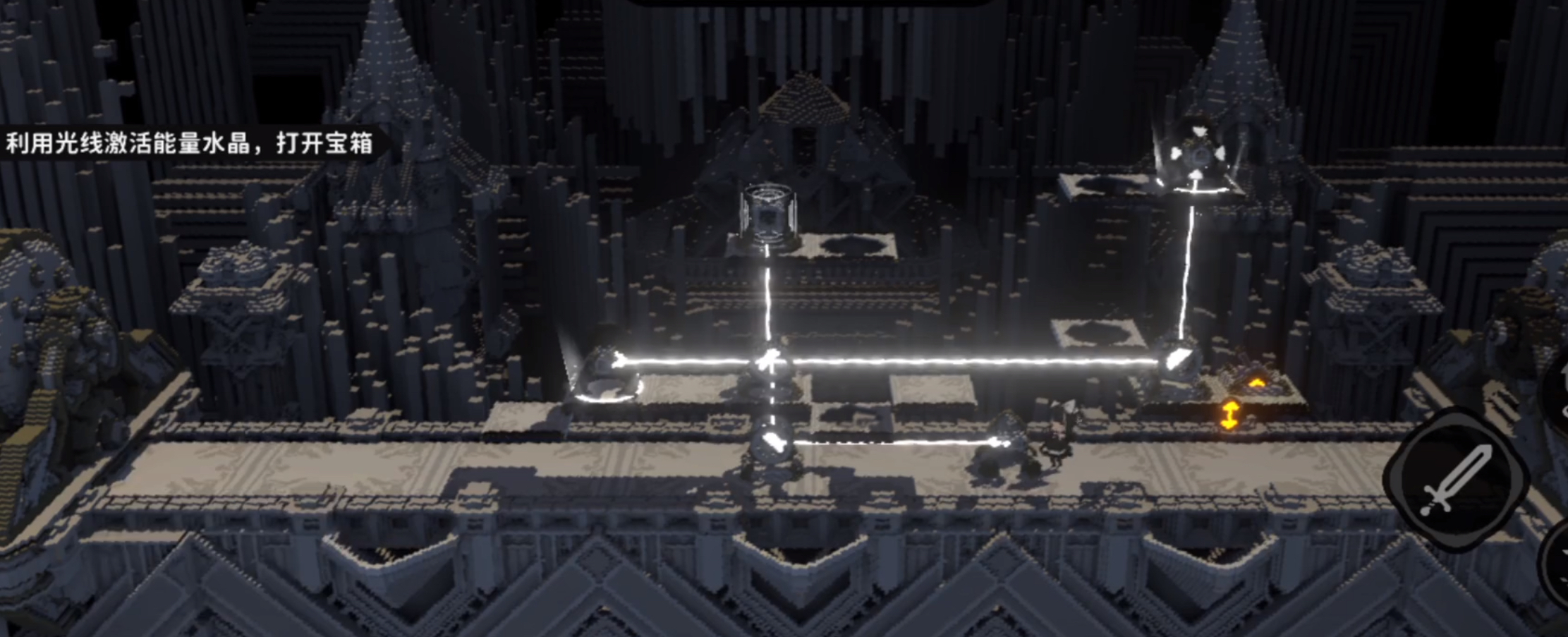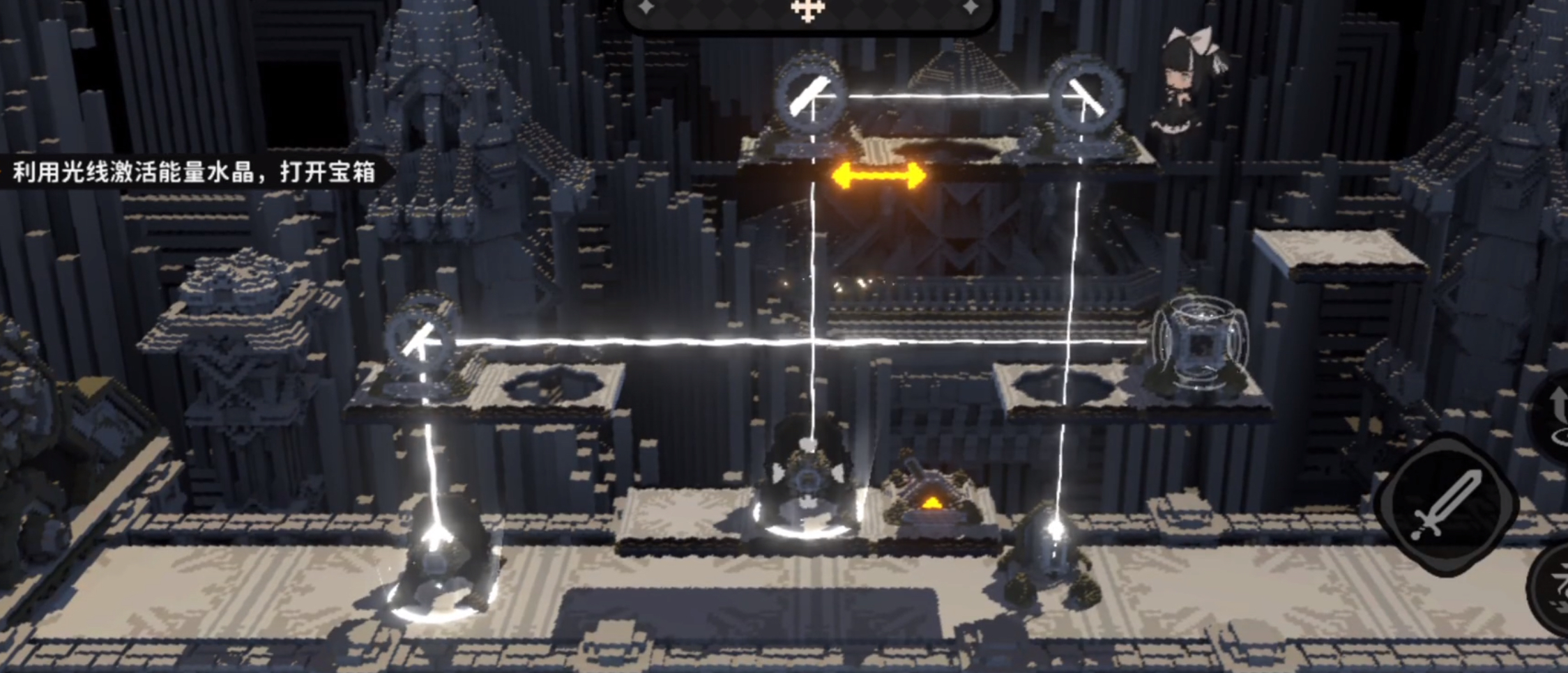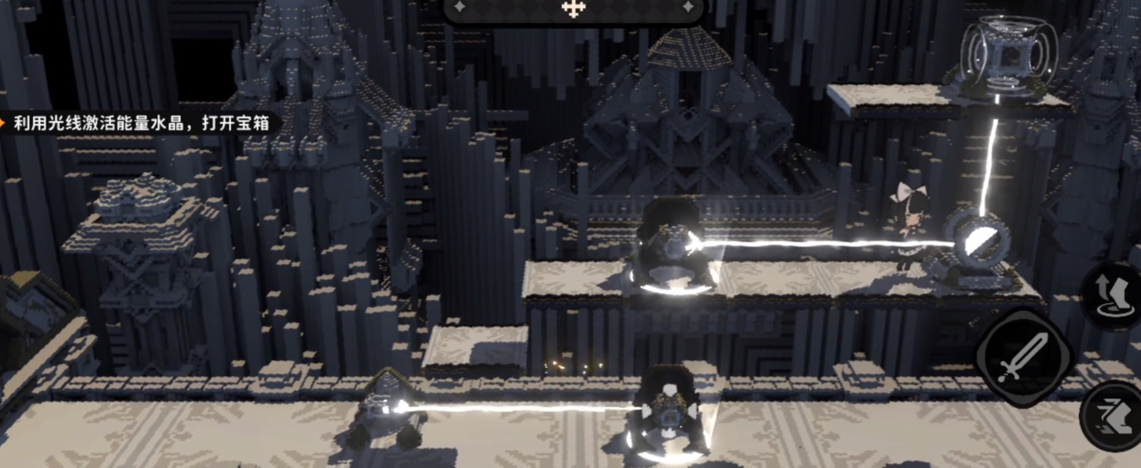第一关位于白塔智识层,进入地图后,“寻宝人”即出现在入口处,与其对话即可开启挑战。此关难度较低,首先找到初始交互点,点击后向右前进,随后使用跳跃功能抵达第二个平台,在此处调整光线方向,使其准确对准宝箱位置即可完成任务。第二关设在生息层,进入后持续向前跳跃至第二个大型平台,点击交互按钮使镜面翻转向上,平台随之下降至地面。接着向左移动至中央交互点,再次翻转镜面让光线垂直向上。最后调节右下方的镜面角度,使光线水平射向右侧目标区域,即可成功通关。