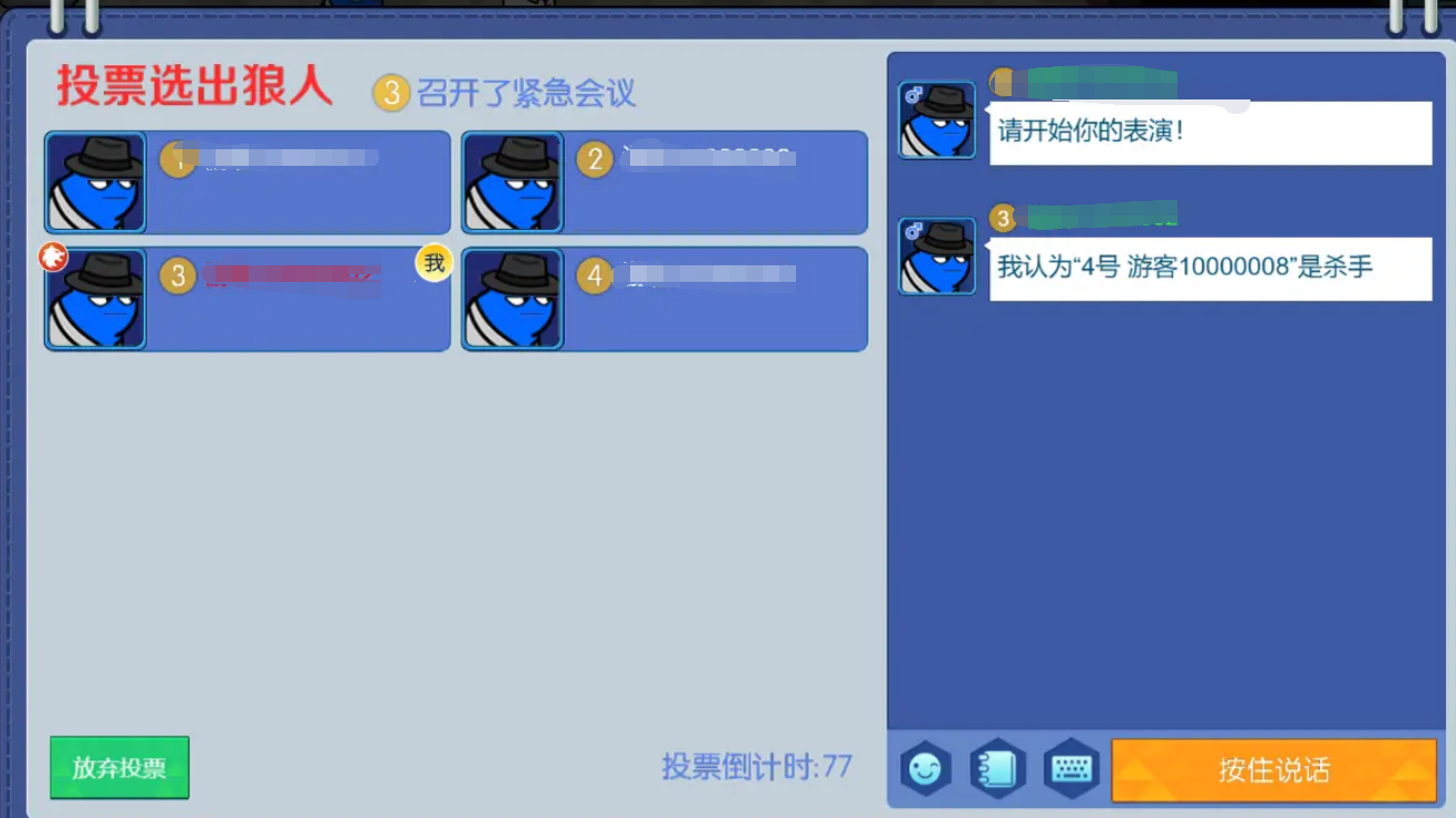在一轮紧急会议结束后,会议开启一轮投票,所有的普通人玩家可以将认为嫌疑最大的狼人,直接投出阵营内。