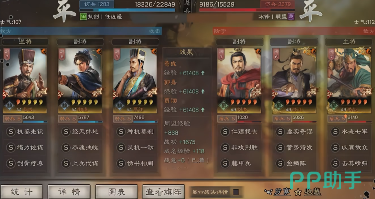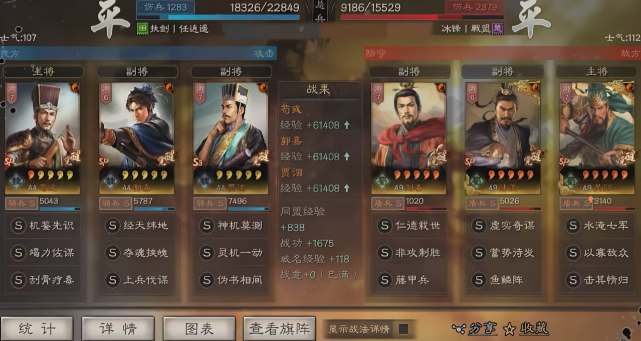 SP郭嘉通常携带“夺魂挟魄”与“上兵伐谋”(或“当锋摧决”)。前者可高效转化敌方属性为己用,后者则契合当前版本法系爆发节奏,在智力加成下伤害显著提升。兵书选择“大谋不谋”“鬼谋”“将威”,以最大化主动战法发动率与输出效率。贾诩则主推“灵机一动”与“婴城自守”。“灵机一动”可叠加至三层,同步提升智力与统帅属性,完美适配五谋骑体系中高达8个战法依赖智力数值的设计逻辑,综合性价比突出。