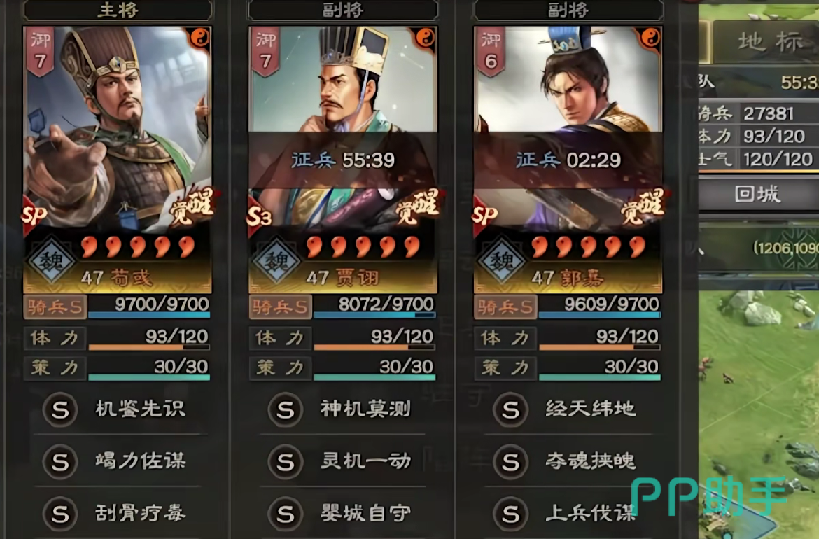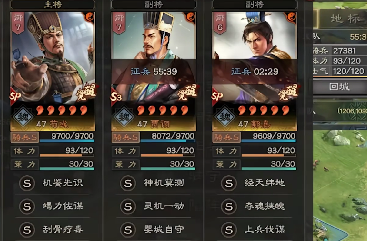 坐骑配置方面,理想状态下为三位武将各配一匹“疾驰马”。若资源有限,优先级顺序为:SP荀彧>SP郭嘉>贾诩。若无疾驰马,可退而求其次,为SP荀彧装配“扶危”,SP郭嘉选用“出奇”作为替代方案。