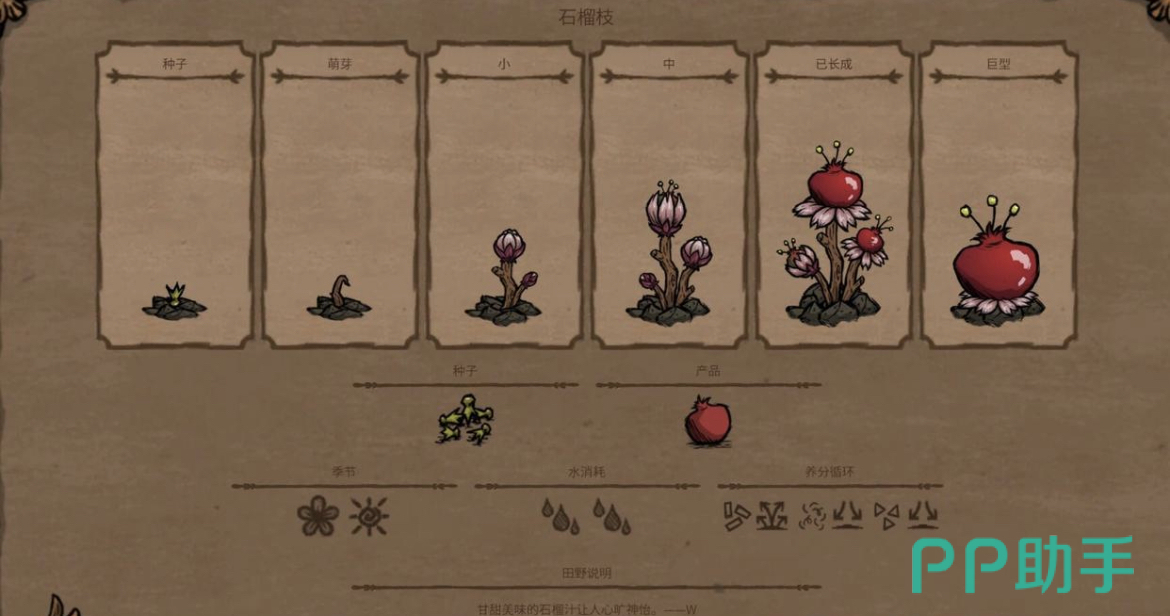第6种植物石榴,它的种植周期很长,但是它的果实很好吃,能帮助你快速补充你的体力,因为它的糖分很高,可以用来榨一些石榴汁,或者直接食用也可以。