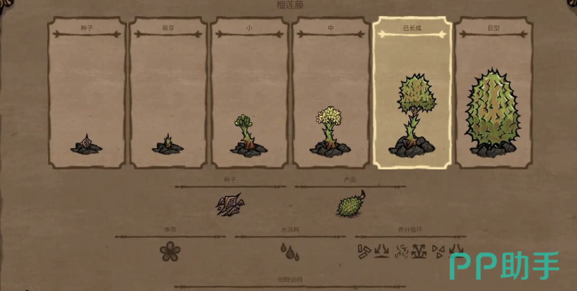 第5种榴莲,榴莲的作用可以帮助你生产荆棘,因为它的果肉可以食用,它的壳可以用来保护你建造篱笆,能让房屋的防御力变强,而且榴莲树的树枝非常的庞大,十分粗壮,能直接利用它的树枝作为支架。