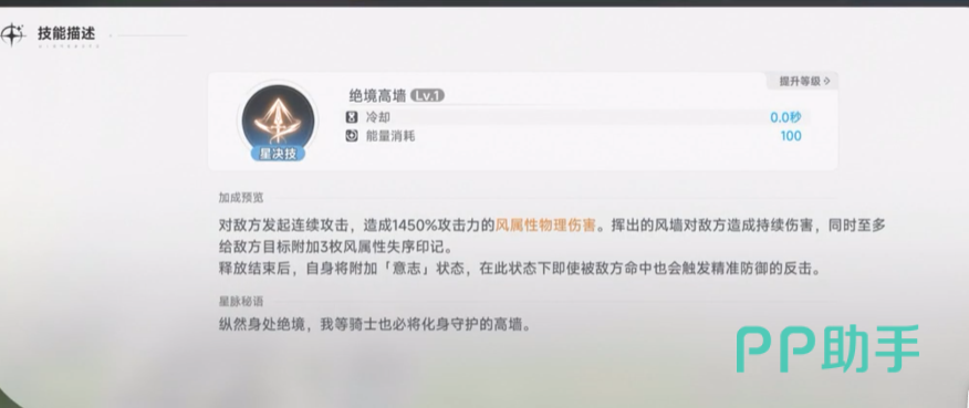此为莉莉的星决技能,能够对敌方单位进行多段打击,总共造成1450%的风属性物理伤害。施法过程中生成的风墙将持续对周围敌人造成伤害,并附加3枚风属性失序印记。技能结束时自动进入意志状态,一旦受到攻击即可激活精准防御机制,实现攻防一体。