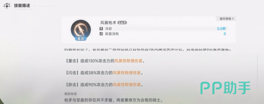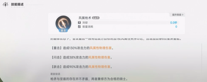 这是莉莉的普通攻击技能,可发动五段连击,总计造成394%的风属性物理伤害。若在霸体状态下释放该技能,最后一击将额外附加一枚风属性失序印记,并为自己积累6点星决蓄能,提升后续大招释放效率。