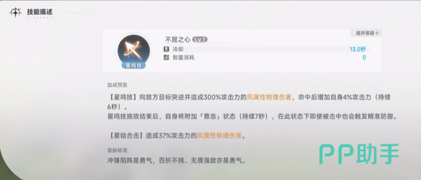 作为莉莉的星鸣技能,使用后会向目标方向突进,造成300%的风属性物理伤害。命中敌人后,自身攻击力提升4%,持续6秒。技能结束后进入持续7秒的意志状态,在此期间具备触发精准防御的能力,增强生存与反击机会。
