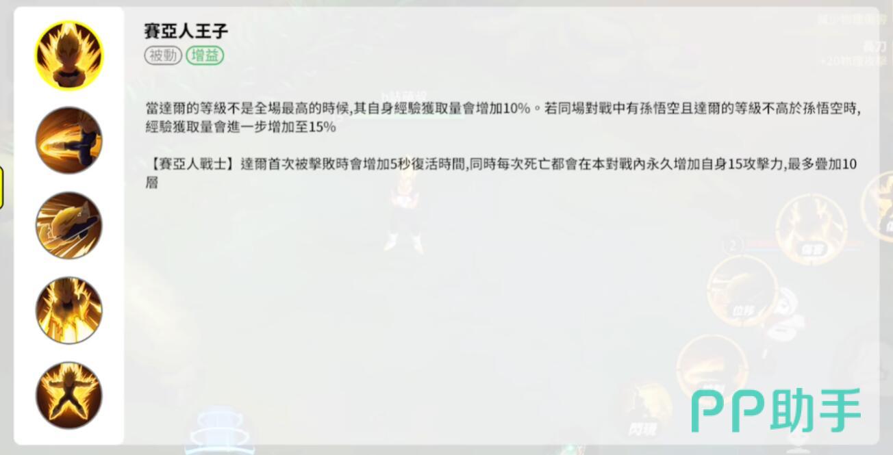 贝吉塔的被动技能包含双重效果。其一为经验获取增益:当自身等级未达到全场最高时,可获得10%的经验加成;若场上有孙悟空存在(无论敌我),且贝吉塔等级不高于对方,则该加成提升至15%。这一设定鼓励玩家关注等级对比,积极争夺资源以维持发育优势。其二为死亡机制:首次阵亡后复活时间延长5秒,但此后每次死亡都将永久提升15点攻击力,最多叠加10层(即总计150点)。该机制既限制了无意义送死行为,又赋予其后期强力反打的能力。在低分段对局中,可考虑前期主动牺牲以快速积累攻击力。