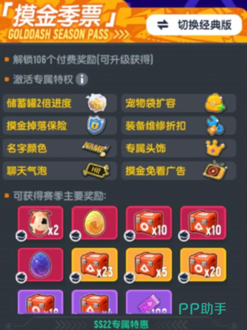 而摸金季票则更侧重于实战与资源获取效率的提升。其核心权益包括:储蓄罐进度×2、宠物背包容量扩充、摸金掉落保护机制、装备修理费用折扣,以及专属头饰、名字颜色、聊天气泡和限定款时装等奖励。该路线特别适合热衷探索与资源积累的玩家群体。
