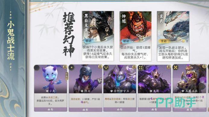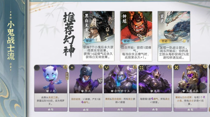 成型路径清晰高效:首推阴兵作为起手核心,其每回合结算自动产出瘴气,并触发鬼将被动,批量生成战士单位。中期过渡依赖奈何桥守卫与玄武,前者稳定扩充战士数量,后者提供关键生存保障;五岳卫兵为中后期质变节点,与小鬼存在深度联动机制——每层瘴气均可强化其召唤效率,层数越高,小鬼产出越密集。小鬼本身兼具单位属性与素材功能,必须列为优先培养对象。幻神位推荐黑白无常,其专属效果可高频获取小鬼,大幅压缩阵容成型周期。