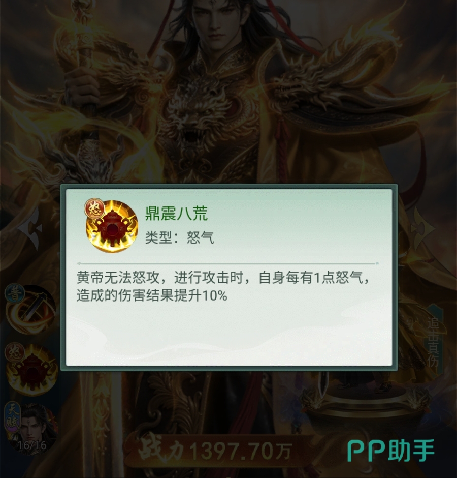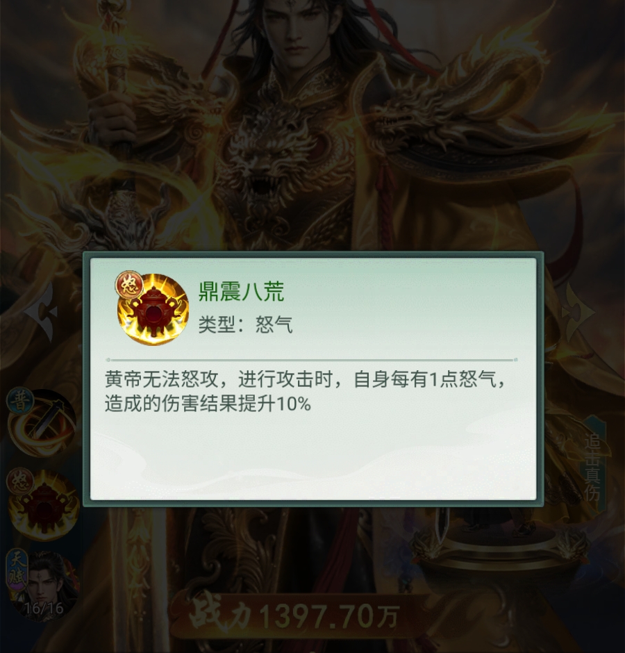 综上所述,黄帝是典型的“普攻+追击”双轨输出型核心角色,依托怒气不衰减、可叠加的特性,配合轩辕阵营的多重增益与真仙3重的真实群伤,构成了层次丰富、容错率高且上限突出的战斗体系。其机制深度与实战表现均证实其具备作为主力长期培养的价值。