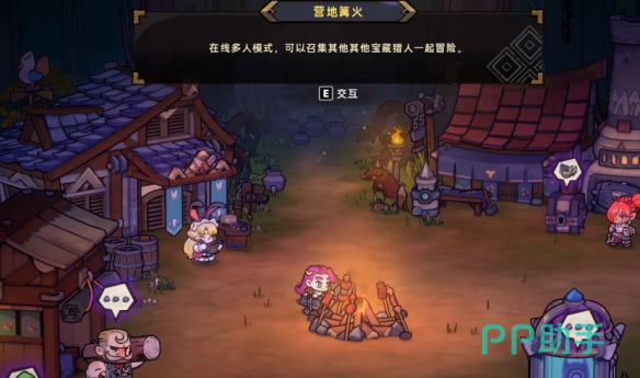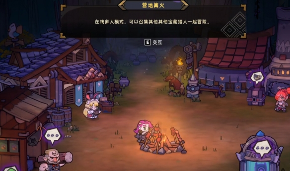 把本地联机的选项给确认好以后,返回游戏界面,前往营地,在营地中会看到一团正在燃烧的篝火,点击一下篝火,篝火上面就会出现一个e键,e键代表的是多人模式,这个模式可以让更多的冒险者加入冒险之旅。