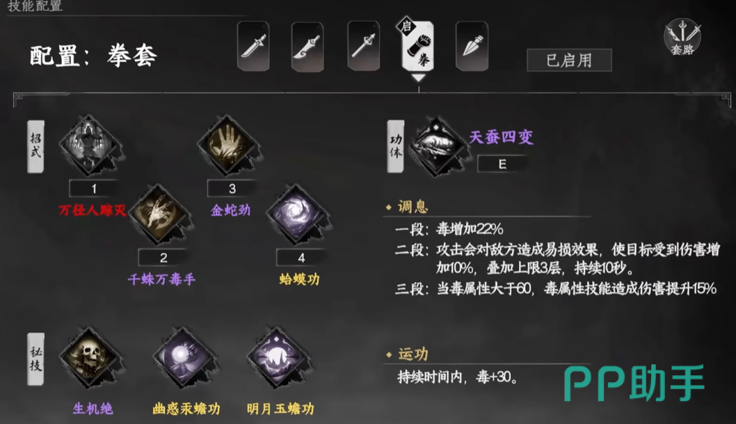 下一站江湖2中的毒拳并非传统意义上的武器,而是一种结合特定外功与内功所形成的毒性战斗流派。其核心机制在于通过装备具备中毒效果的拳法秘籍,如万毒秘传,搭配天蚕四变等内功,实现持续性伤害输出。每当攻击命中目标时,便会叠加中毒debuff,因此该流派更适合持久战节奏,依赖时间累积造成高额真实伤害。