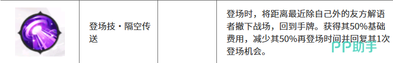 基恩的核心机制围绕三大技能,其中之一的登场技叫做隔空传送,当激活此技能时,系统会自动锁定战场上最近的非队长友方单位,将其瞬移回备战区的同时返还该单位基础费用的50%,并大幅缩短其再次登场所需的冷却时间,这一设计突破性地实现了战场资源的即时回收利用,尤其在应对突发战况或调整阵型时,能够快速腾出空间部署新单位,值得注意的是,该技能严格遵循优先级规则,仅作用于友方角色本体,对召唤物无效,这要求玩家在使用前需精准判断目标选择。