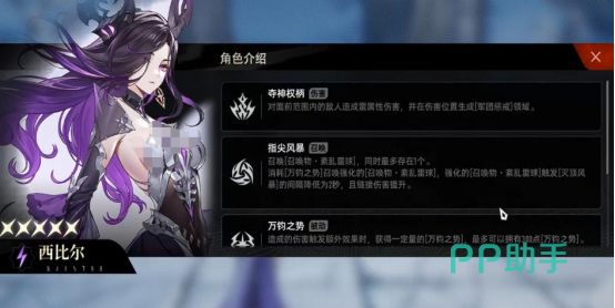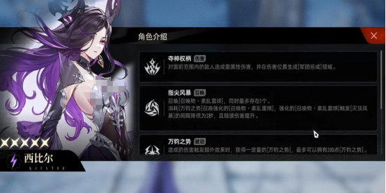 首推五星雷属性角色西比尔,她在队伍中可作为核心输出主力,具备高效的召唤机制,在持续作战中能稳定提供额外伤害来源。其技能“夺神权柄”配合“指尖风暴”与爆发性大招,能够在战场上迅速制造雷元素覆盖区域,打乱敌方行动节奏,并对群体目标造成高额范围伤害。无论是清理杂兵还是应对高难度精英单位,西比尔均有稳定且强力的表现。该角色养成路径平滑,前期即可发挥显著作用,资源需求较低,无需复杂配装即可展现强大战斗力,非常适合新人玩家用于开荒阶段快速建立优势。