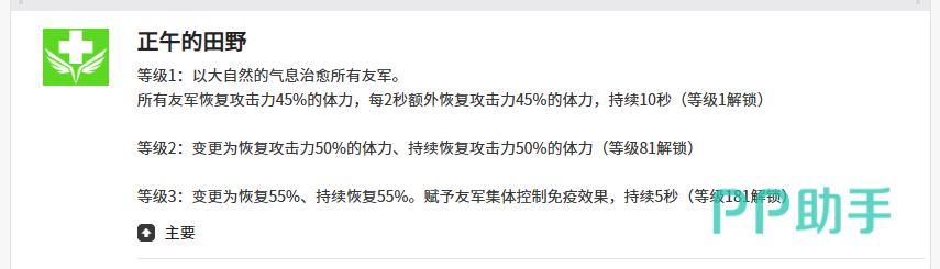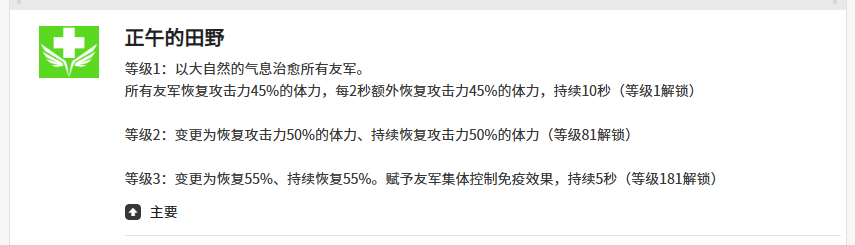 一技能「正午的田野」为核心群疗手段:释放后立即为全体友方恢复相当于克拉拉攻击力45%的生命值,并在随后10秒内每2秒额外恢复一次。该效果随技能等级提升至3级后,基础治疗量升至攻击力55%,同时新增全体友军10秒内免疫控制效果——此特性需角色达到181级方可激活。