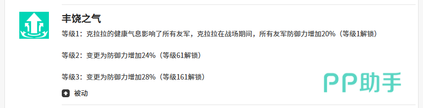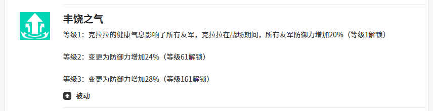 四技能「丰饶之气」提供防御向团队增益:在场期间有概率触发,为全体友方提升20%防御力,最高品质下可提升至28%;该增益仅在敌方行动回合生效,有效增强承伤阶段的生存阈值。