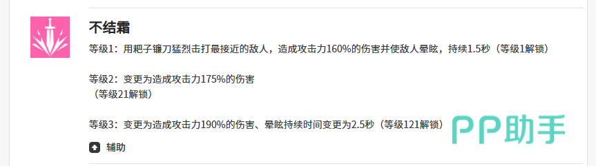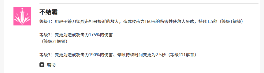 二技能「不结霜」为单体强控输出技:克拉拉挥动镰刀突进至最近敌人,造成160%攻击力的伤害并附加1.5秒眩晕;升至3级后,眩晕时长延长至2.5秒,显著提升关键回合的节奏压制力。