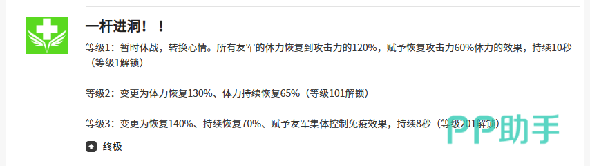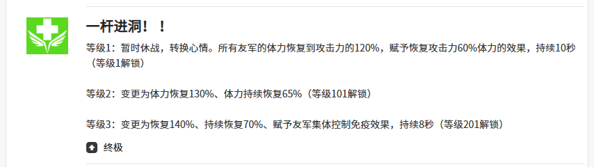 终极技能「一杆进洞」为战略级回血技:立即为全体友方恢复相当于克拉拉攻击力120%的生命值,并维持10秒持续治疗效果,适合作为先手保命或衔接后续输出链的关键启动技能。