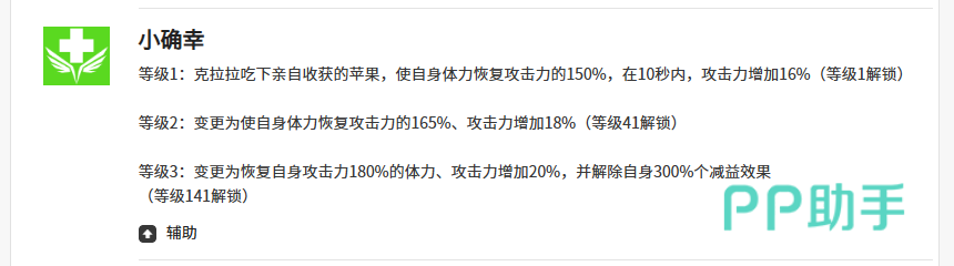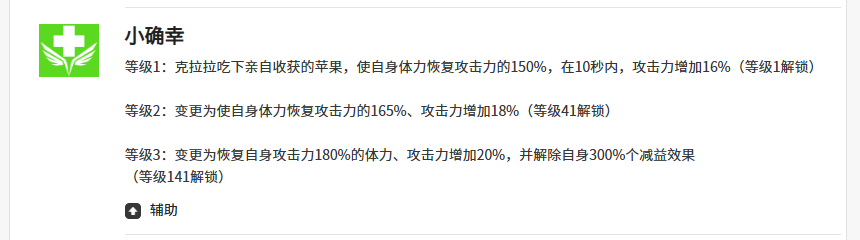 三技能「小确幸」聚焦自身维稳:生成一枚苹果,食用后立即恢复克拉拉攻击力150%的生命值,并在接下来10秒内获得16%攻击力加成;升至3级时,额外解除自身全部减益状态,解除效果强度达300%。