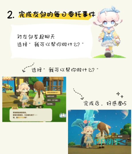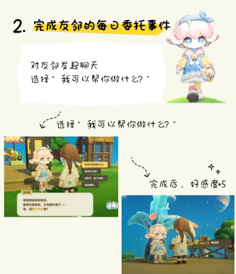 协助完成每日委托是快速提高亲密度的有效途径,单次任务即可获得5点好感度,效率相当可观。在日常对话中询问“有什么我可以帮忙的吗?”便有机会接取对应NPC的任务需求。这些委托通常贴近生活情境,比如帮助解决赤脚行走被刺伤的问题,或是满足某位居民的小小心愿。虽然任务难度不高,但代入感十足,完成后不仅能增进感情,还能深入体验游戏世界的细腻设定。