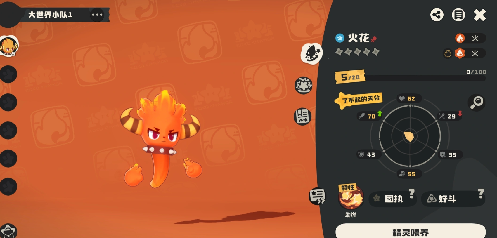 火花为火系输出型精灵,核心机制围绕“叠层增伤”展开:每次成功施放火系技能可叠加1层被动效果,最高可叠至3层,每层提升15%火系技能伤害。该机制使其在连续作战中输出呈阶梯式增长,尤其适合面对成群小怪时快速清场;挑战Boss前优先叠满3层,再衔接高倍率范围技能,爆发效率突出,是前期开荒节奏最快的初始选择。