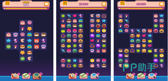 色彩斑斓的世界以及风格迥异的图案组合在一起,给玩家带来了极强的视觉盛宴,这款。游戏中拥有了众多挑战的关卡,每个关卡中都会有规定的时间,需要在有限的时间之内,通过点击屏幕的方式将两个相同的图案放在一起快速消除,每次在消除的时候都会获得相应的分数,游戏关卡中,还有很多辅助的道具可帮助玩家顺利闯关。