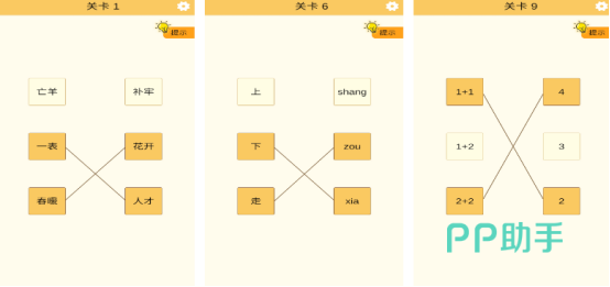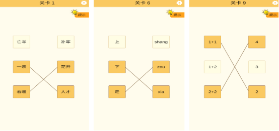 拥有了极强的教育心,还秉持着寓教于乐的核心准则,所有的关卡难度都是循序渐进的,玩家可通过逐渐闯关的方式挑战自我,其实对于很多孩子来说是值得体验的,这里比如有成语的连线或者汉字以及拼音的连线等等。孩子在体验游戏时可结合自己的喜好选择,每个关卡中都会随机出现题目。