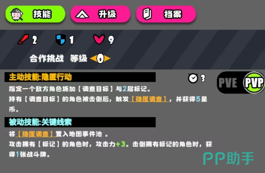 该机制不仅强化团队生存与控场能力,更直接提升邦妮的输出效率——只要攻击带有标记的目标,其攻击力即提升3点;若由邦妮亲手击倒已标记敌人,则额外获取1张战斗牌。因此,PVE场景下最高效的打法是:优先布设标记→协同队友完成击杀→持续刷新隐匿调查阶段→最大化星币收益与战斗牌循环。