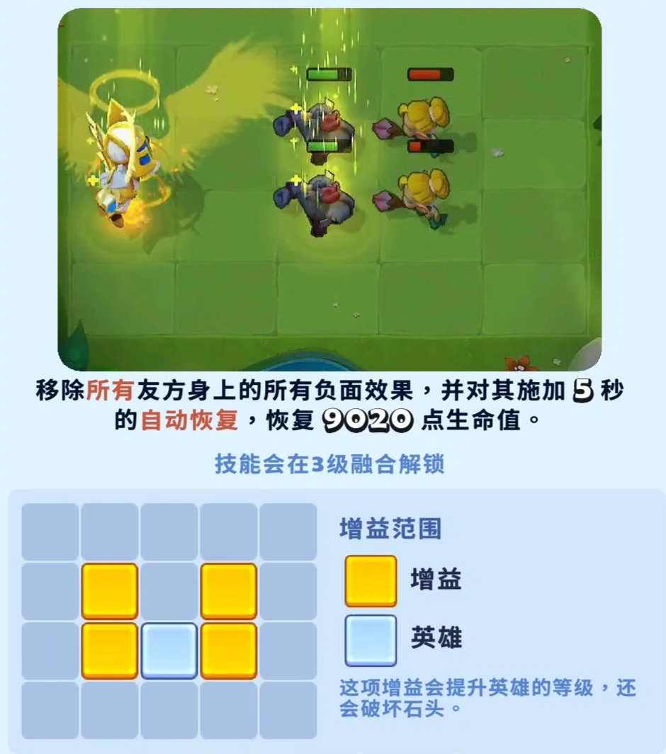 天使的核心技能需在3级融合后激活。施放时可清除所有友方单位的负面状态,并为全体队友附加持续5秒的自动回血效果,总计恢复9020点生命值。该技能在面对带有中毒、灼烧或减防类持续伤害的敌方阵容时尤为关键,能够在危急时刻迅速拉高全队血量,扭转战局节奏。