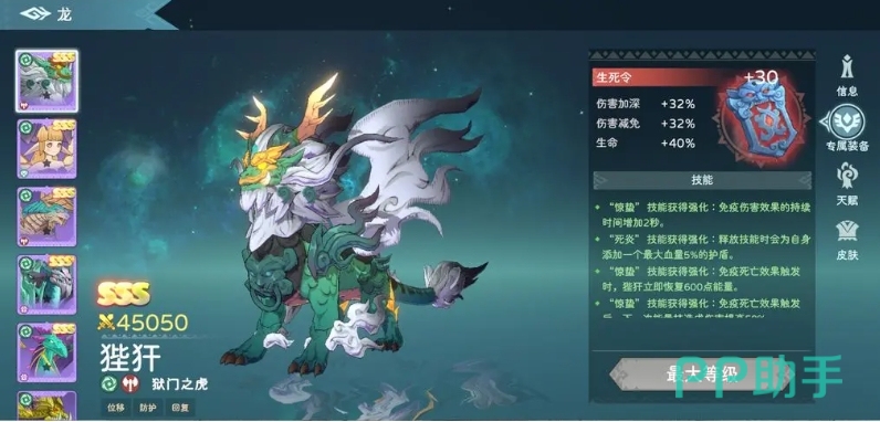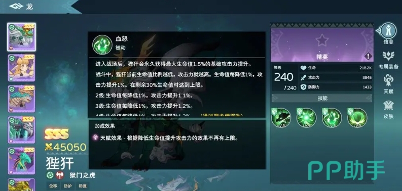 三技能血怒则为狴犴赋予了独特的成长机制,自进入战场的那一刻起,它便会永久获得基于最大生命值1.5%的基础攻击力提升,而且在战斗过程中,狴犴的攻击强度还会随着自身生命值比例的降低而不断增强,具体来说生命值每减少1%,攻击力就会相应提升1%,当剩余生命值降至30%时,其攻击力将达到上限,此时的它在爆发力上面就展现了更惊人的效果。