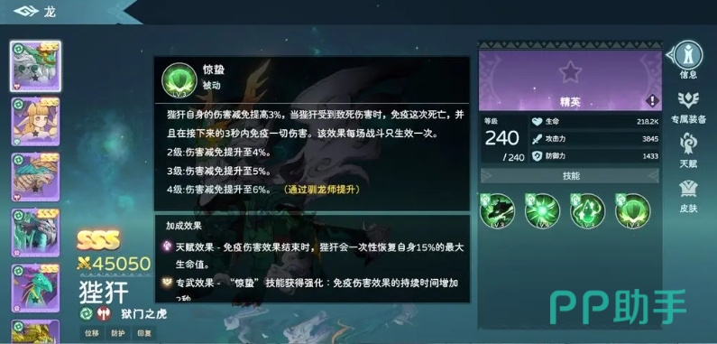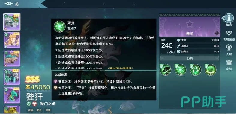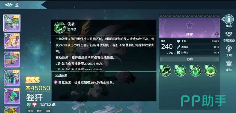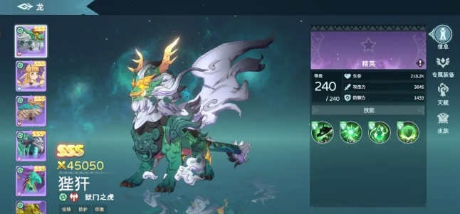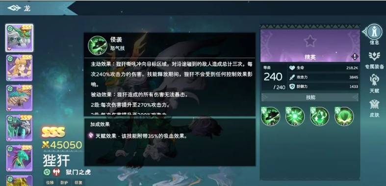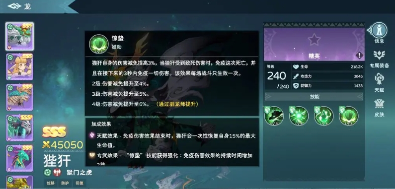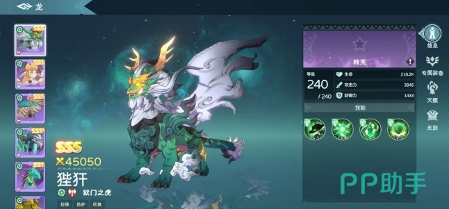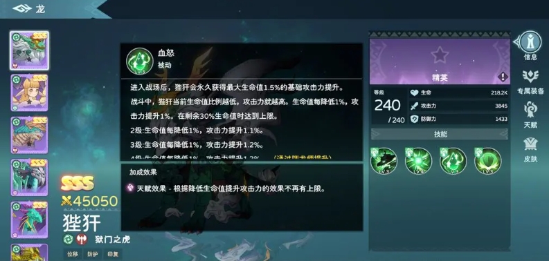 狴犴详细的四维数据为,攻击力高达3845,暴击伤害更是达到了惊人的150%,防御力有1433,血量则厚实地达到了218200,在游戏中的定位是一个龙族战士,兼具一定的坦度和较高的输出能力,它的一技能侵袭堪称强力突袭神技,当主动触发时,狴犴会发出震天的嘶吼冲向目标区域,在冲锋的过程中,会对沿途所碰到的所有敌人造成总计三次打击,每次都能打出相当于自身240%攻击力的伤害。
