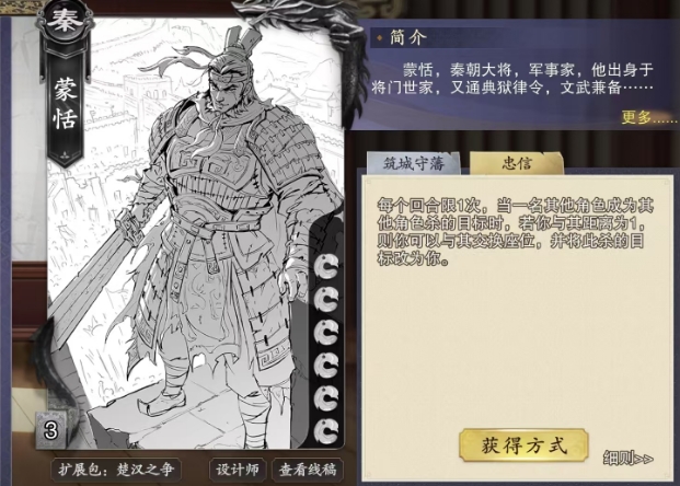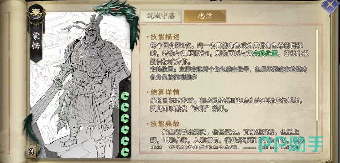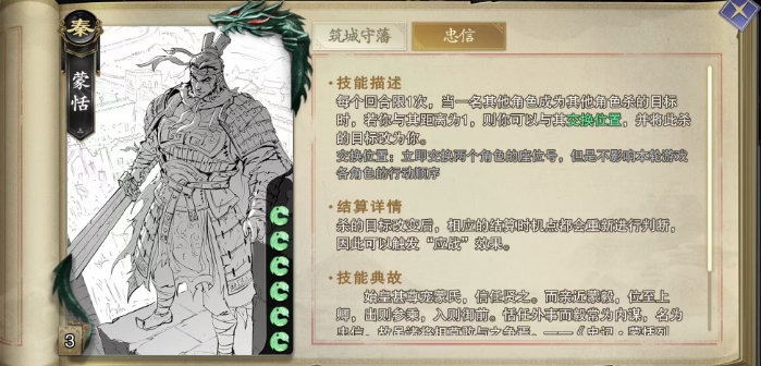 蒙恬的第二个技能叫做忠信,是一项每回合限用一次的独特能力,当战场上一名角色遭遇另一名角色的杀击时,如果蒙恬与该目标角色的距离恰好为1,那么他可以选择发动忠信技能,与这名角色交换位置,并将此杀的矛头指向自己,这一交换位置的效果立竿见影,会立即更新两名角色的座位号,但重要的是,这种位置的更替并不会打扰到本轮游戏中各角色的行动顺序,保持了游戏的公正。