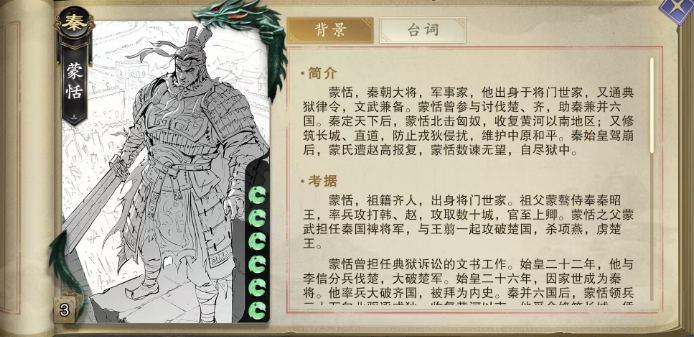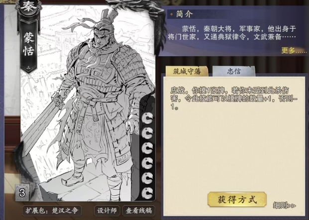 蒙恬的独特技能筑城守藩,在应战之时也就是当蒙恬成为杀的目标时,他能够触发此技能,摸取1张牌作为应对,这一摸牌机制不仅考验着蒙恬的应变能力,也为他后续的行动提供了更多的可能性,筑城守藩技能还具备动态调整摸牌数量的特性,若蒙恬在应战中未受到此杀的伤害,无论是通过闪避、防御技能或是其他角色的援护成功抵消了杀击,都会使得此技能在下一次应战时摸牌的数量增加1张,最多可增至3张。
