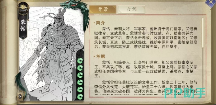 要是大家在代号杀里面更喜欢秦国阵营的话,其实蒙氏两兄弟是前期很多玩家都会先用的两张卡,当然这一点也不代表代号杀蒙恬好用吗就是肯定的,因为人设上他不仅武艺高强,更兼通典狱律令,可谓是文武双全,智勇并重,而在游戏中,蒙恬这张卡牌以初始6格体力登场,后期的用法上面主要看技能。