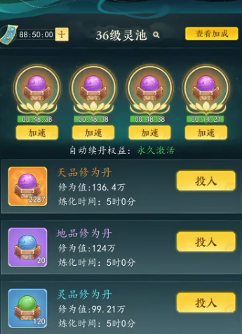 进入灵动期后,灵池系统正式开放。玩家可向灵池投入丹药进行炼化,低阶丹药经炼化可升格为高阶品质,显著提升修为转化效率。灵池炼化速度与角色当前境界直接挂钩——境界越高,炼化耗时越短;同时,提前升级灵池等级亦可获得额外炼化加速加成,进一步优化资源产出节奏。