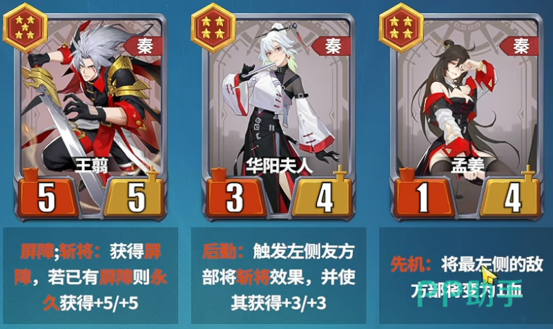 在完成核心三角搭建后,需补充高爆发、多段伤害型输出角色以稳定触发斩将阈值。王翦与白起在此定位中表现尤为契合:二者不仅基础输出数值顶尖,其技能设计天然适配斩将节奏——单次施法即可造成多次独立伤害判定,大幅提升斩将触发频率与覆盖率。
