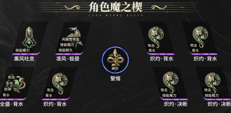 目前主流存在三种适配不同玩法的魔之楔构建方向。第一种为战技爆发流,聚焦于“破茧”状态下“逐光”技能的连锁伤害。该技能释放的浮光鳞粉可叠加印记,暴击时触发额外风属性爆炸伤害。因此配置重点在于技能威力强化与神智维持,角色槽推荐装配凛风・极昼与熏风吐息,前者提升风属性技能基础输出,后者增强鳞粉印记触发频率;同律武器方面则优先选择缩短技能间隔的词条,确保逐光与终结技无缝衔接,实现高效连段输出。