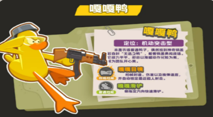 “嘎嘎鸭”是游戏中人气较高的突击型角色。外观诙谐但实战表现扎实。其核心技能为“嘎嘎目镜”——开启后显著提升射击速率与单发伤害,并自动锁定距离最近的敌方目标,大幅降低瞄准压力,新手可快速打出稳定输出。另一主动技能“嘎嘎滑铲”支持向指定方向高速位移,兼具规避火力与调整身位功能。两项技能联动性强:先开目镜持续压制,再滑铲脱离,既能完成爆发连招,又能有效规避反制,攻防转换极为流畅。
