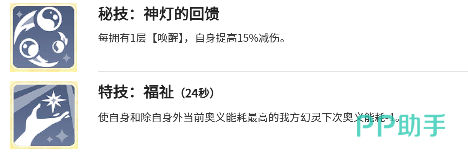 “神灯的回馈”提供防御向联动机制:每拥有1层“唤醒”,角色即获得15%伤害减免,多层叠加可形成可观承伤缓冲,大幅提升持续作战能力。特技“福祉”冷却24秒,作用于自身时可降低下次奥义能量消耗;亦可指定一名奥义能耗较高的队友,同步削减其奥义所需能量,加速全队奥义循环节奏,支撑高频爆发组合。被动技能“神格愿力神盾”强化治疗容错——当治疗使目标生命值恢复至100%时,立即为其附加相当于祈愿神灯自身最大生命值15%的护盾。