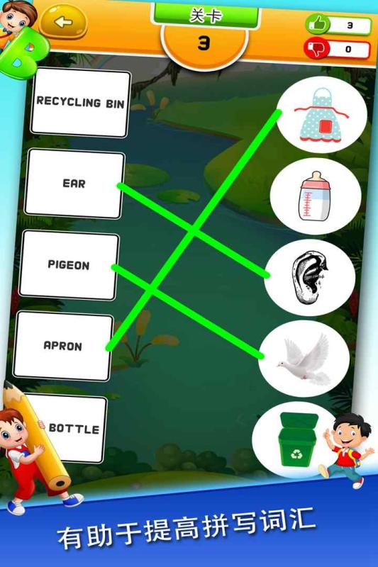 学习一些英文字词的话,两方面都能被你们全部掌握,游戏按照连连看的玩法方式进行的设计,带来的参与感会更加的投入,专心的挑战过程给我们的体会是最舒服的,《英文连连看》这款手游中有着很多的关卡,足以让孩子们认识不同的单词及其汉字意义,家长们可以在旁边稍微的帮忙一下哦。