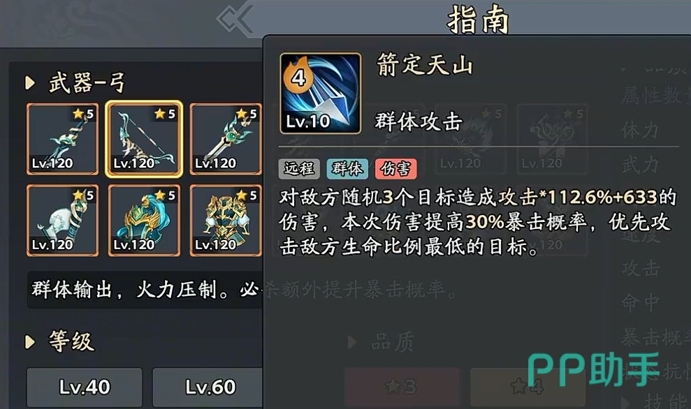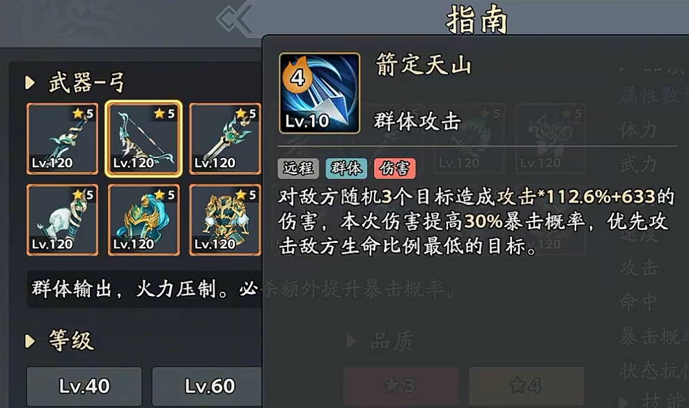 群体清场效率突出,主动技能“箭定天山”可随机锁定3名敌人造成高额倍率伤害;释放时额外提升30%暴击率,并内置残血优先判定逻辑——自动倾向攻击当前生命比例最低的目标,在副本推图与日常刷怪中表现优异。