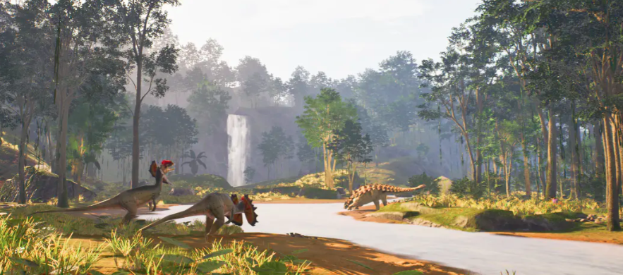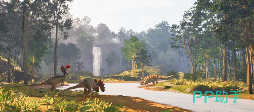 本作构建了一个高自由度的史前开放世界,玩家可化身多种可驯化恐龙,在广袤无缝地图中自由探索、采集资源、建造据点并维持生存。环境生态高度拟真——不同生物具有明确的昼夜活动规律,晨昏交替不仅影响光影表现,更直接决定稀有异兽的出没时段与行为模式,策略性交互由此成为核心玩法之一。