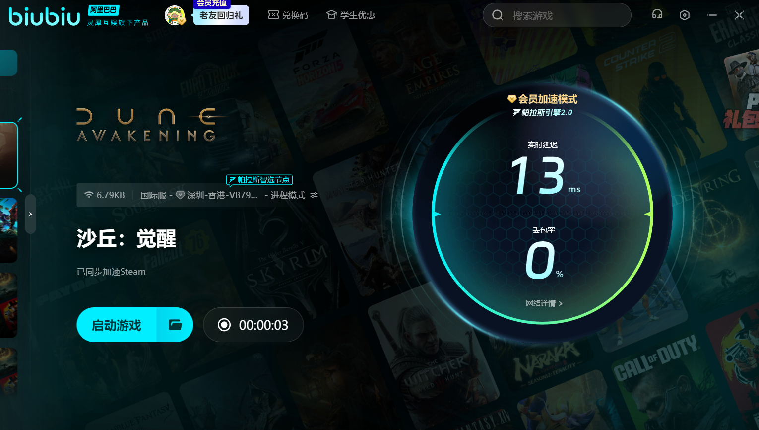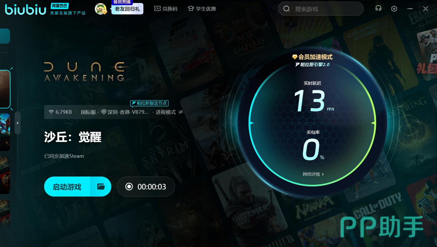 在启动的状态下,延迟率、丢包率等关键数据实时展示,网络情况一目了然,大家可见小编的实时延迟低至13ms。biubiu的节点遍布全球各大地区,一旦检测到网络波动,帕拉斯智能节点会自动秒级切换最优线路,保障游戏稳定运行。更贴心的是,biubiu不仅能加速作品的本体,还同步支持Steam商店的优化,让更新下载速度大幅提升,节省更多等待时间。