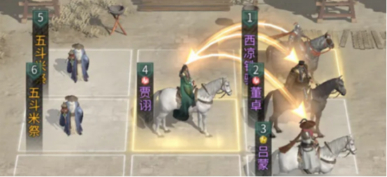在布阵层面,需打破常规追击位惯性思维。推荐将徐庶置于前排追击位,与后排贾翊形成双向追击呼应;吕蒙则调整至中排承伤位。兵种配置上,吕蒙身后部署五斗米祭,徐庶身后同样配置五斗米祭,用以强化控制抗性与状态延续;同时,在徐庶正前方前置西凉铁骑,利用其高机动性与突进能力,为徐庶争取更优出手环境并提升首回合控场覆盖率。