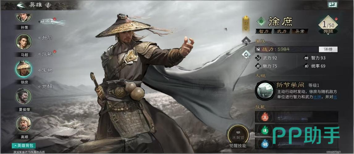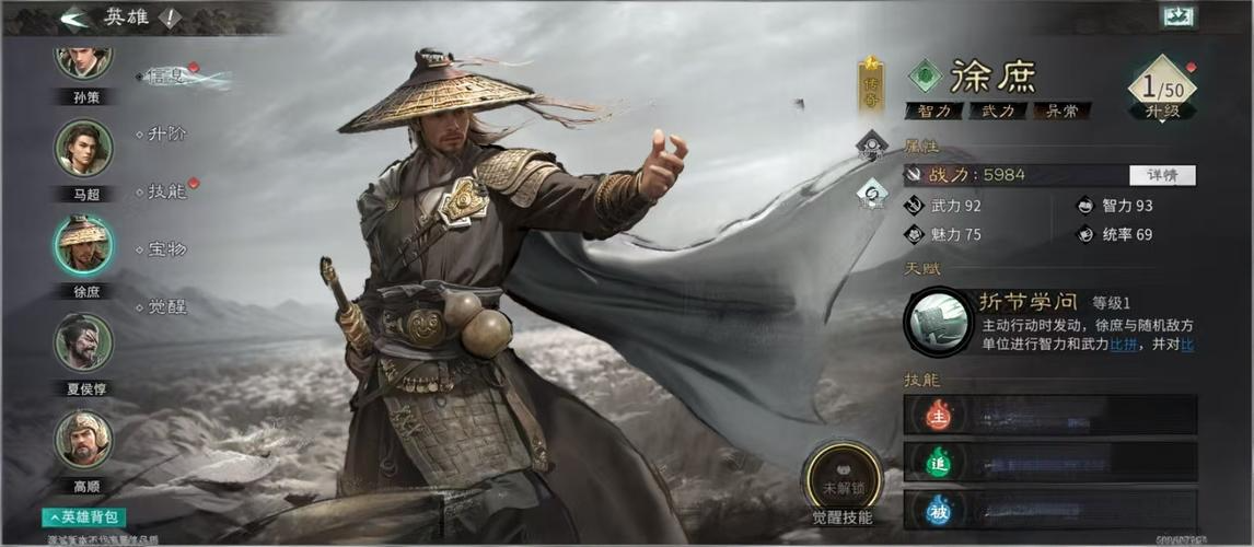 徐庶的天赋“折节学问”并非单纯输出型技能,其本质是构建“比拼—伤害—技穷”三位一体的压制循环。每次比拼胜利不仅造成高额智力伤害,更会施加技穷效果,直接限制敌方智力型武将的主动技能释放频率,大幅削弱其战术主动性与连招强度。
