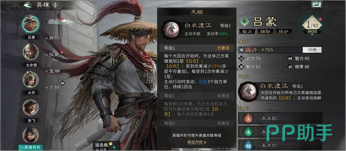 吕蒙的天赋“白衣渡江”具备双重战略价值:一方面可主动触发挑衅,强制吸引敌方集火,实现伤害引导;另一方面能为相邻友军提供伤害抵消护盾,并同步提升其韧性属性,显著增强全队生存容错率,尤其适配中后期高爆发环境。